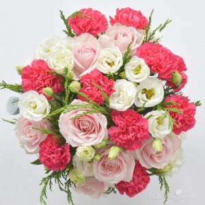 Bình hoa gồm: – Rose Sweet Avalanche – 10 cành – Cát Tường trắng – 5 cành – Cẩm Chướng Đơn hồng sen – 20 cành – Lá Tùng – 2 cành – Chậu gỗ bình nước (màu sắc ngẫu nhiên).