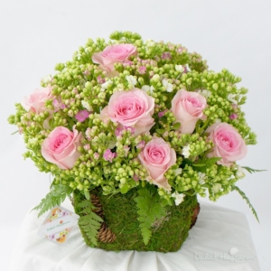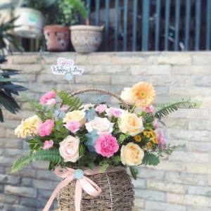 Giỏ hoa bao gồm: Cẩm chướng đơn hồng – 20 cành Cát tường trắng viền hồng – 5 cành Cúc nhánh hồng Sakura – 5 cành Sao tím – 1 bó Giỏ giấy màu hồng loại trung
